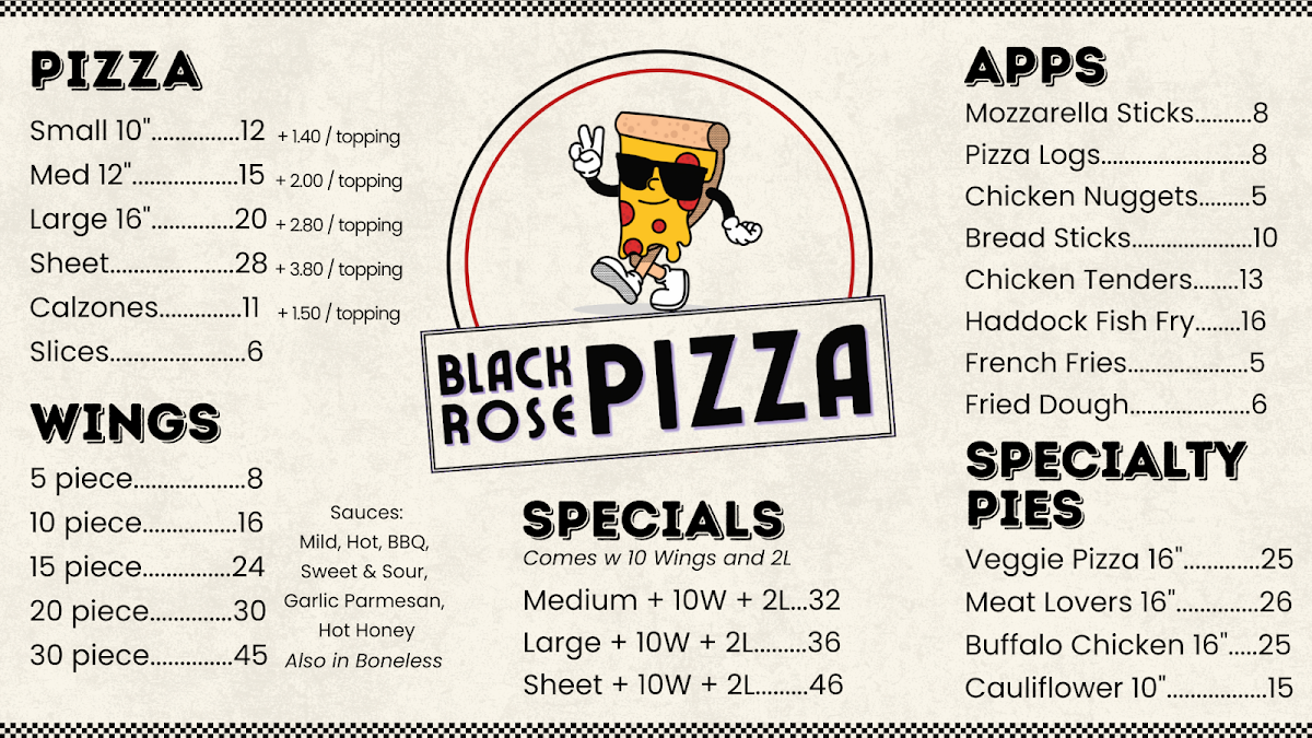 Black Rose Pizza offers a straightforward and familiar menu focused on classic pizza favorites with a few comforting sides and snacks. Whether you’re stopping by for a quick slice or ordering a full pie for a casual night in, the selection feels approachable and satisfying without fuss.
